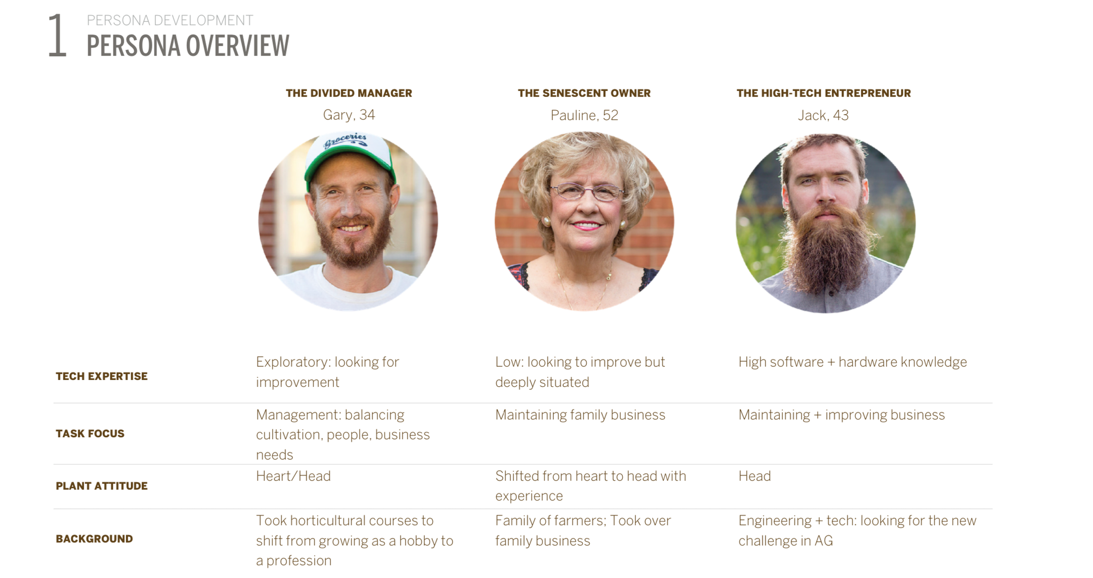 A key part of the discovery phase was evaluating AROYA’s user personas. Personas are research-backed representations of core user types that capture their goals, behaviors, and pain points, helping designers stay grounded in real needs. For this project, a third-party consulting group developed six personas representing different cultivators and facility operators. These perspectives guided our design decisions, ensuring that every feature and workflow aligned with how AROYA’s users actually think and work.
