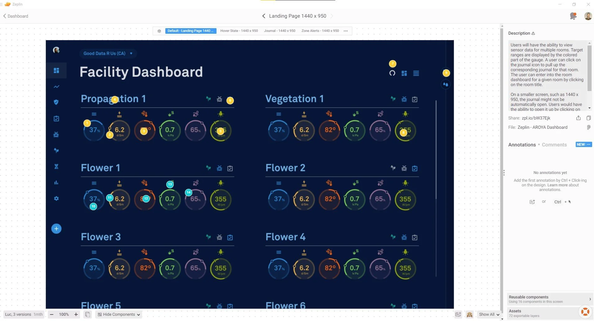 For this project, I imported the Figma designs into Zeplin, giving engineers a clear, inspectable version of every layout and component. In Zeplin, I added detailed annotations describing interaction behavior, variable states, and the exact hex codes and patterns used across the interface. This level of clarity helped the development team understand design intent, align with the reusable component library, and implement the dashboard more accurately and efficiently.