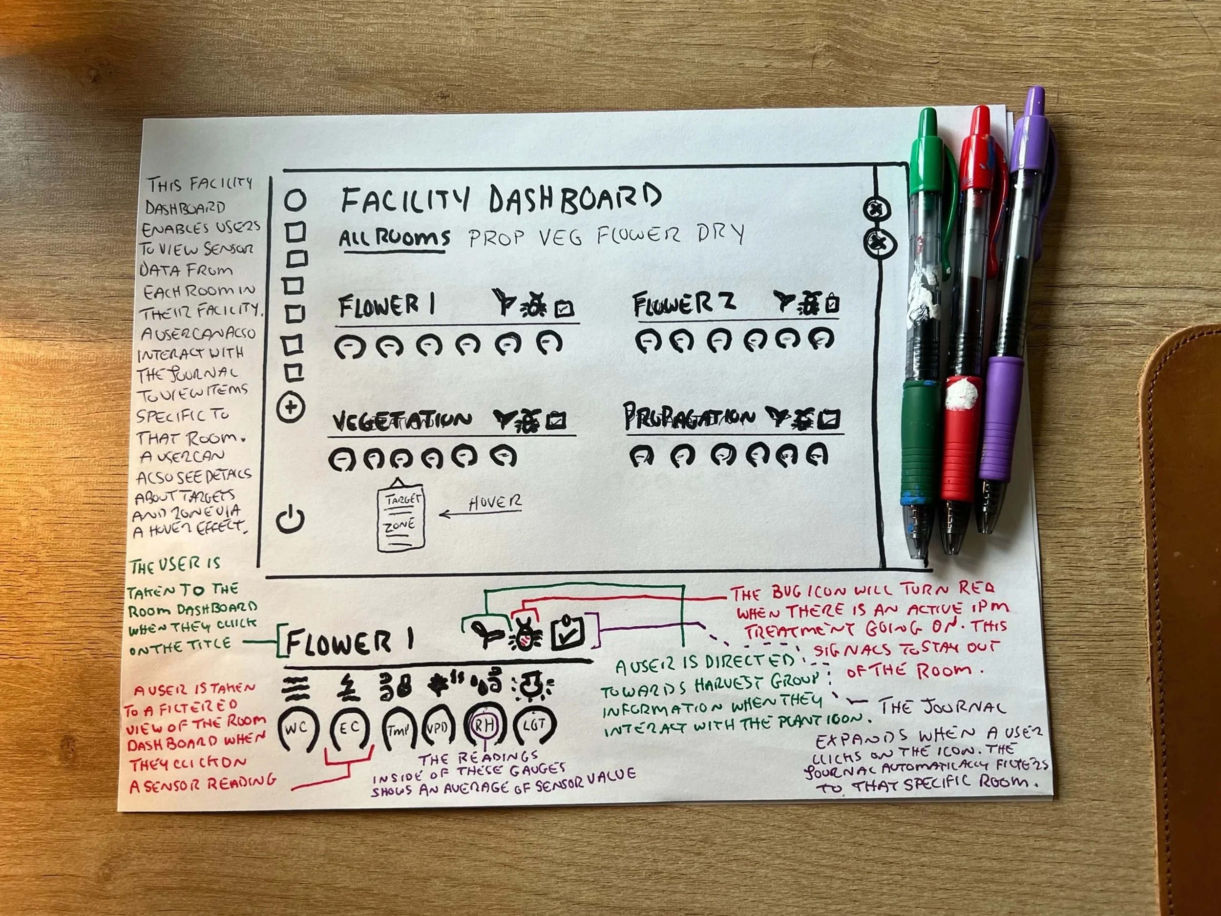 For this project, I designed and launched the Facility Dashboard—a real-time hub that centralizes sensor data from every room in a commercial grow operation. Before this, managers were tracking conditions manually across scattered spreadsheets, slowing decisions and creating avoidable errors. I began with targeted user interviews and workflow analysis, then moved into wireframes and high-fidelity prototypes. I designed the final interface to be intentionally simple: hover over any metric to view its target range, add journal notes directly on room cards, and instantly review harvest groups and IPM treatments. I partnered closely with engineering to refine the details, collaborated with marketing on positioning, and kept executives aligned through regular demos. I also owned QA for every design decision we shipped. The impact was immediate—feature adoption increased sharply, workflows became more efficient, and managers gained the real-time clarity they needed to make confident operational decisions.