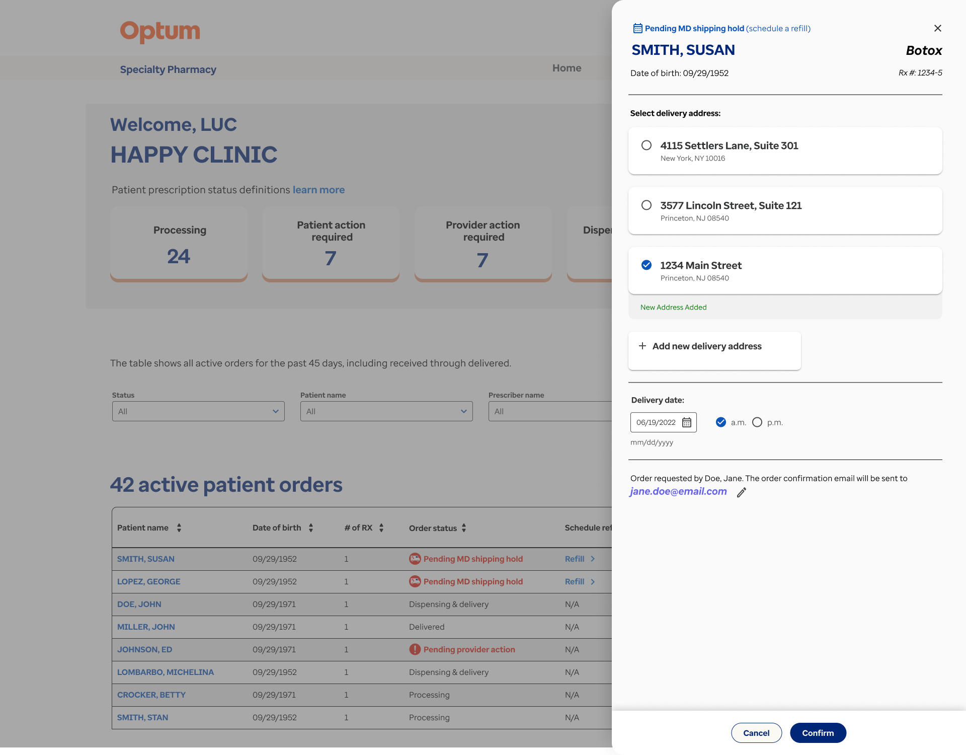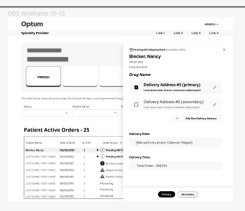 I designed and implemented a digital prescription refill flow that enabled healthcare providers and their assistants to refill patient orders directly within Optum’s Specialty Provider Portal—eliminating the slow, manual process of calling in refills. The new interface allows users to quickly identify and prioritize orders with an “MD shipping hold” status, open a refill drawer to review or edit patient information, select delivery dates, and process multiple orders consecutively in a single session. This significantly reduced manual steps, improved turnaround time, and enhanced provider satisfaction. I partnered closely with product and engineering stakeholders to define requirements, create wireframes and high-fidelity prototypes, and ensure pixel-perfect implementation. The product owner estimated the new digital workflow would save over $100,000 annually by reducing call-center dependency and increasing operational efficiency.