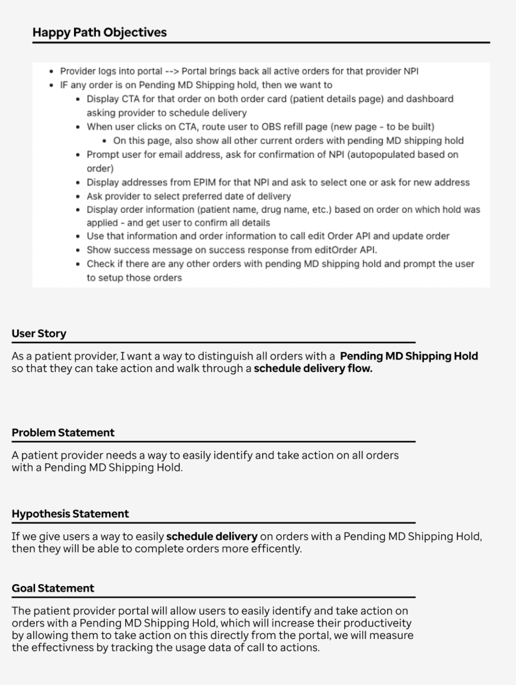As we defined the project direction, I partnered with the product lead to clarify requirements and shape a strategy focused on streamlining refill management. A key objective was to help users quickly identify orders with a pending shipping hold and to provide a clear call to action button (CTA) that triggered a guided digital workflow. To measure adoption, we planned to track CTA engagement and determine how many providers transitioned from phone-based refills to the new digital process.
